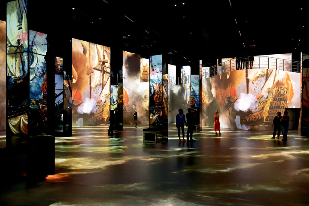 Mehr als 325 Werke von rund 50 Künstlern werden hier auf monumentalen, bis zu zehn Meter hohen Wänden zum Leben erweckt – begleitet von einem eigens komponierten Soundtrack. Die Besucherinnen und Besucher tauchen ein in eine Epoche voller erzählerischer Tiefe: in das intime Licht Vermeers, in Rembrandts dramatische Hell-Dunkel-Welten, in Avercamps glitzernde Winterlandschaften und in Jan Steens fröhliche Tavernen. Die Show macht die große Kunst dieser Zeit so unmittelbar erfahrbar, dass man das Gefühl hat, mitten in den Szenen zu stehen.