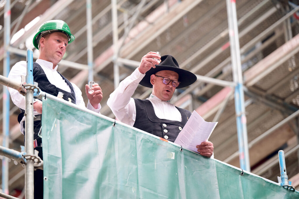 Die Richtfest-Freude packte auch Dr. Andreas Kleinau, Vorsitzender der HafenCity Hamburg GmbH, in seiner Laudatio: „Wir feiern heute nicht nur die Architektur und das unfallfreie und erfolgreiche Ende des Rohbaus. Hier werden – auch durch neue intelligente Wohnungsgrundrisse der Planer – neue Lebensräume für künftige HafenCity-Bewohnerinnen und -Bewohner geschaffen.“ Danach wurde eifrig das vom Bauherrn gut ausgestattete Bauarbeiter-Buffet