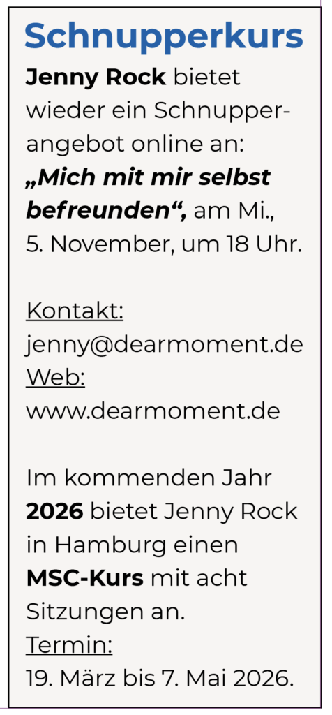 Coaching. Die Lehrerin und Trainerin Jenny Rock aus der HafenCity arbeitet in Teilzeit und bietet Kurse für ein »Achtsames Selbstmitgefühl« an. Den November haben deutsche Vertreter:innen des MSC, Mindful Self-Compassion, zum »Monat des Achtsamen Selbstmitgefühls« ausgerufen