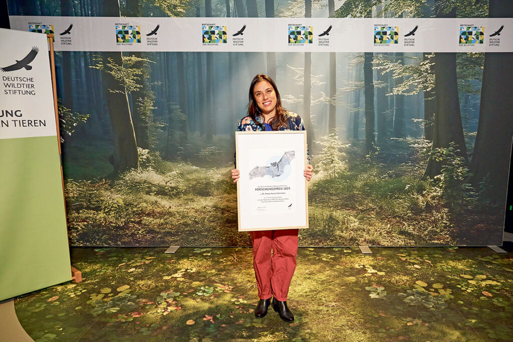 Für ihr Forschungsprojekt mit dem Titel „Von der Geburt bis zur Balz: Eine akustische Reise durch das Leben von Hufeisennasen“ hat sie den Forschungspreis der Deutschen Wildtier Stiftung erhalten. Der Preis ist mit 50.000 Euro dotiert und wurde mit einer Festveranstaltung in der Botschaft der Wildtiere am Stiftungssitz mit Ausstellung, Naturfilmkino und Lernwerkstatt im Baakenhafen verliehen. „Mithilfe der Kombination aus Video- und Lautaufnahmen können mein Team und ich das Lautrepertoire dieser faszinierenden Fledermausarten beschreiben und gleichzeitig mehr über deren Sozialfunktion erfahren“, sagt Preisträgerin Fernandez mit Blick auf wichtige Erkenntnisse für den Artenschutz.