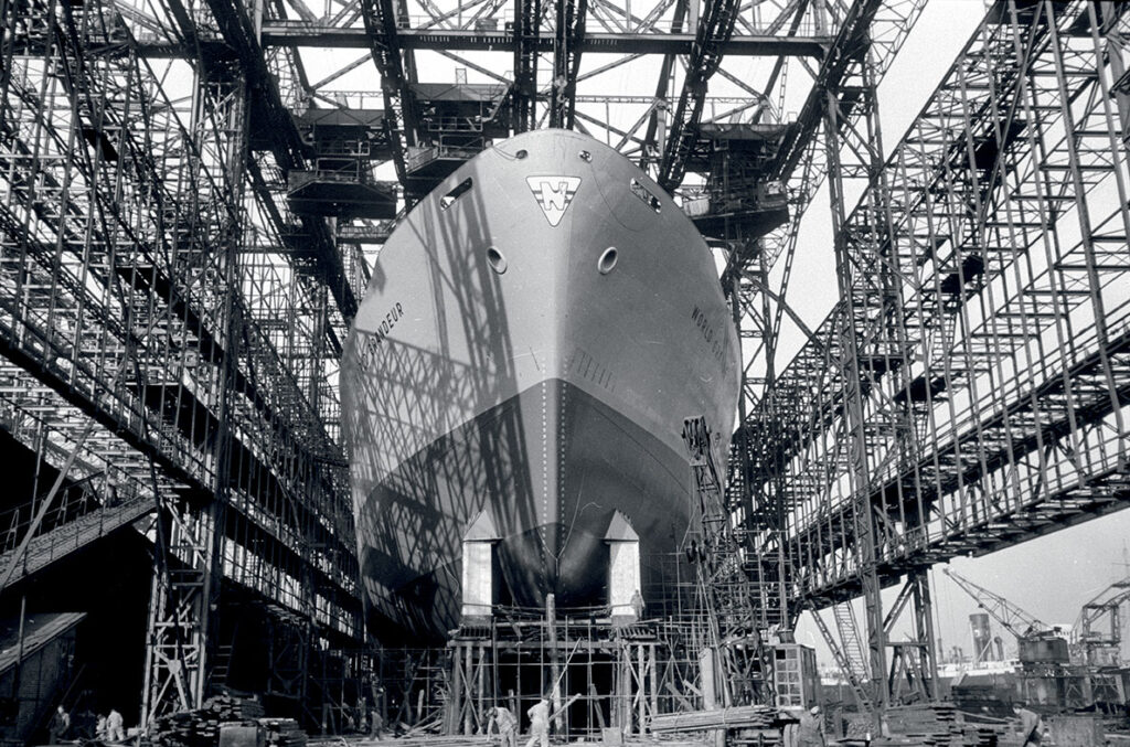 Eines dieser grandiosen Motive ist auch auf dem Veranstaltungsplakat zu sehen. Dabei handelt es sich um den Stapellauf von Niarchos’ „World Grandeur“ am 4. März 1955. Gut sieben Jahrzehnte ist das her.