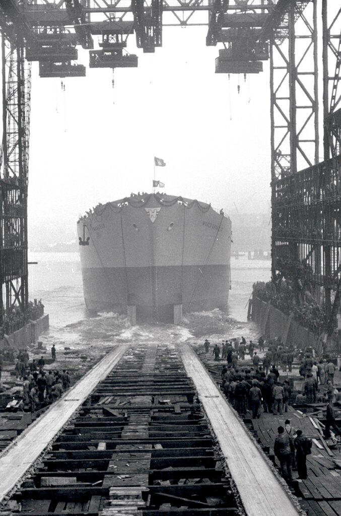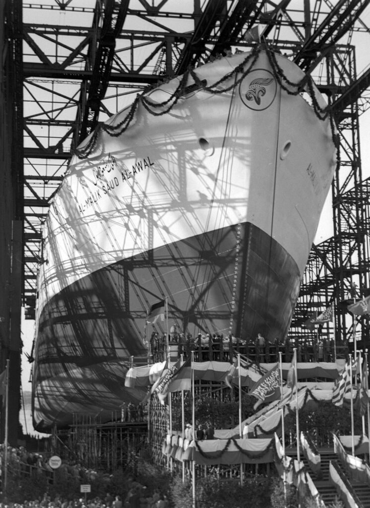 Foto oben: Besucheransturm: Stapellauf des Tankers „Al-Malik Saud Al-Awal“, größer als die legendäre „Tina Onassis“, am 5. Juni 1954. © IMMH