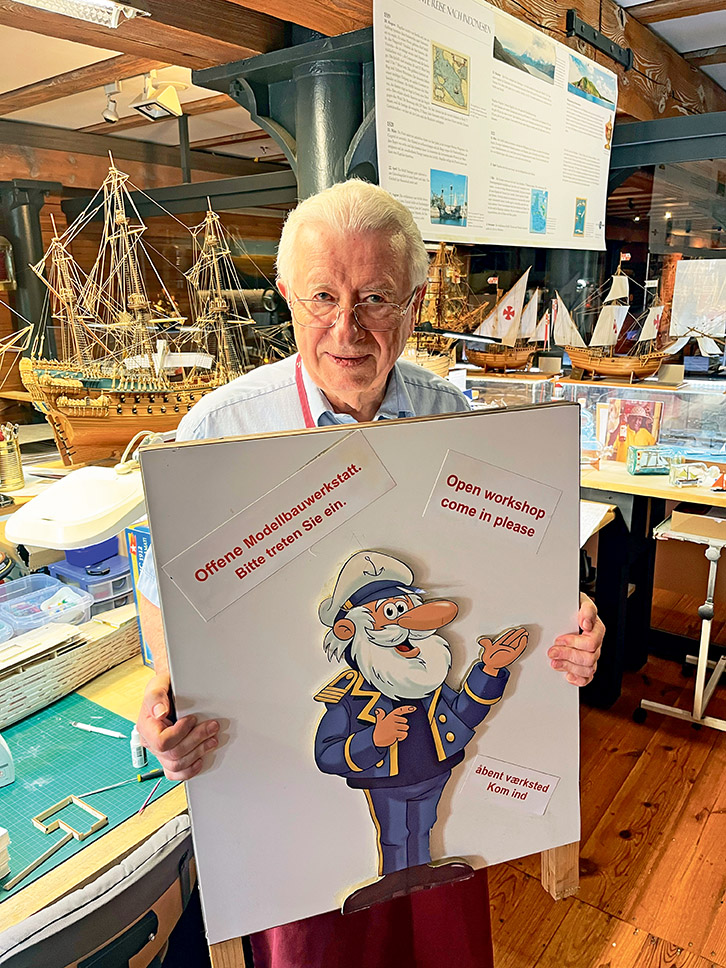 Ein Magnet für wissbegierige Blicke ist auch die Modellbauwerkstatt auf Deck 1. Dort sind ehrenamtliche Enthusiasten am Werk, die sich nur zu gerne auf die Finger schauen lassen. Ganz bewusst befindet sich ihr Eldo-rado hinter einer gläsernen Fassade. Zuschauer sind herzlich willkommen. Manche Besucher reagieren anfangs ein wenig zaghaft, treten nach einladendem Winken jedoch beherzt ein. Moin! Die offene Werkstatt gilt als Refugium, in dem das maritime Herzblut pulsiert. Ein mehrsprachiges Plakat signalisiert: „Bitte keine Schwellenangst!“ Modellbauer mit roten und blauen Arbeitsschürzen freuen sich über Interesse und Fragen.