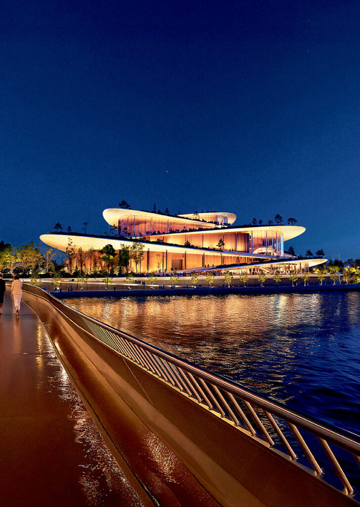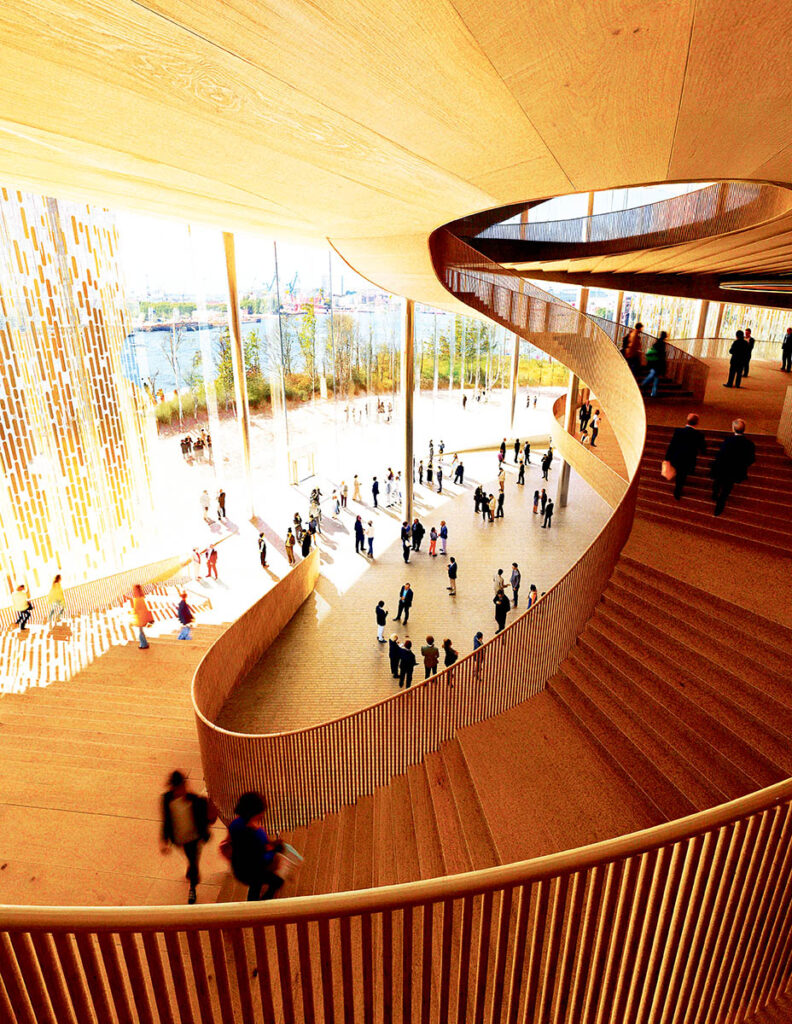Foto oben: Wie ein elegantes Kreuzfahrtschiff liegt das neue Opernhaus der Bjarke Ingels Group auf dem Baakenhöft – in einem öffentlichen Park. In terrassenförmig angelegten Wegen kann man direkt zu den beiden oberen Etagen mit Rooftop-Bar und Restaurant sowie einem 3600-Panoramablick auf Elbe, Hafen und Hamburg gelangen. © BIG & Yanis Amasri Sierra, Madrid, Spain